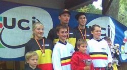 Photo : Justine qui pose avec les différents champions et Kenny Belay ( Multiple Champion du Monde de Trial )