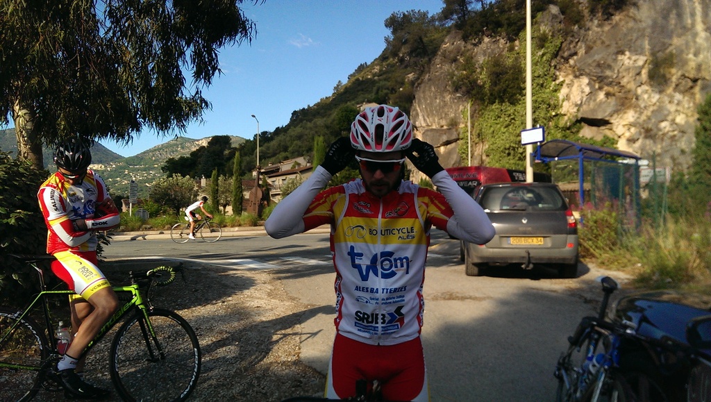 Le retour du soleil donne le sourire aux rescapés de la première journée et c’est reparti tambour battant: la vallée de la Tinée est avalée à vive allure puis nous entamons la grosse difficulté du jour à savoir la montée sur Roubion jusqu’au col de la couillole et ses 17 km à 7,5 % de moyenne. Le rythme très élevé devant nous oblige à nous relever rapidement et à monter à notre rythme.Je m’accroche à un petit groupe avec Sébastien et à mi-pente, je décide d’accélérer pour remonter quelques places,. Yoann rejoint Sébastien tandis qu’Anthony accuse un coup de moins bien dans cette première et difficile ascension.