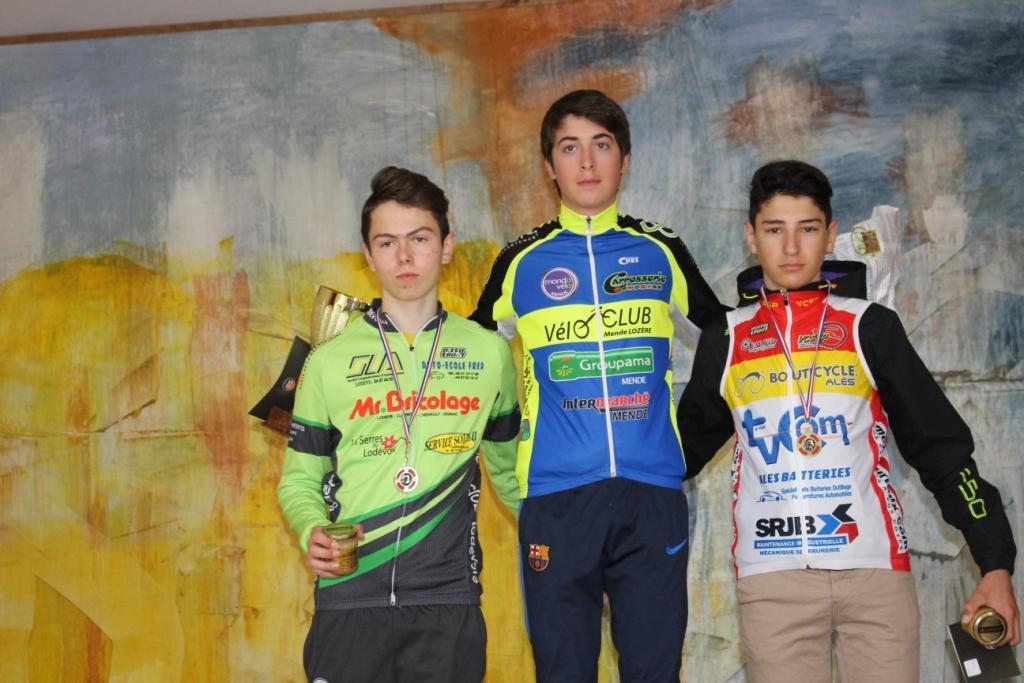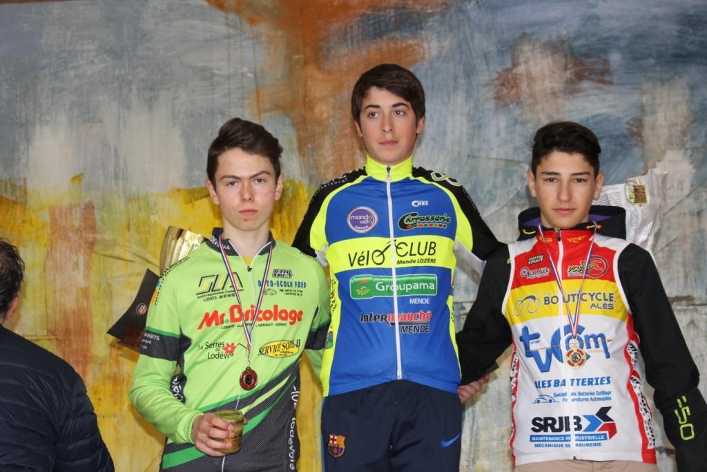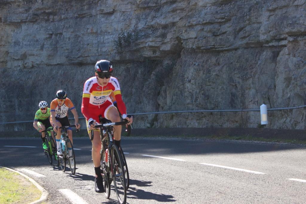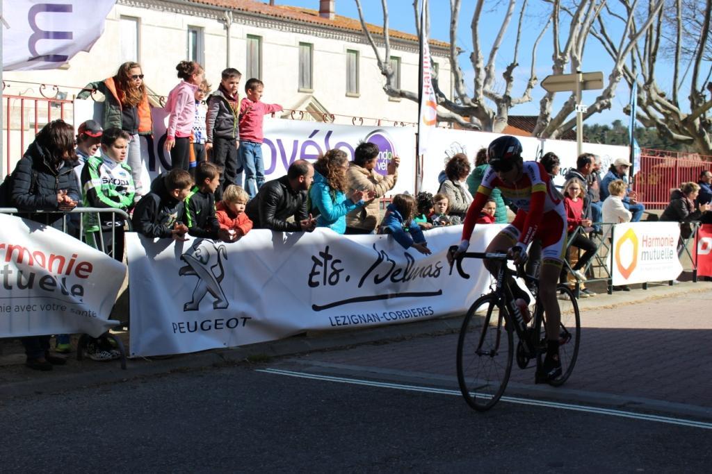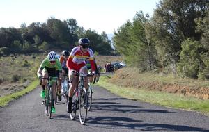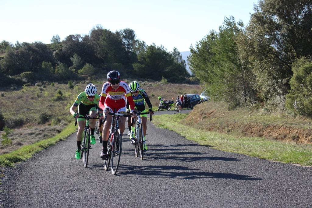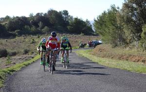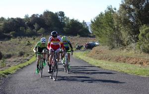 Après avoir rapidement repris Le Narbonnais, il se retrouve alors aux avant-postes d'une échappée à 7 coureurs dans laquelle se trouvent 4 Narbonnais( c'était la course du club et ils ont une équipe!!!) et ses deux coéquipiers de sélection régionale Théo Laurans(Mende) et Lilian Mouillard( Lodève). Avec Théo et Lilian, la collaboration est de rigueur car ils se connaissent bien et sont tous trois des coureurs isolés alors les relais sont efficaces.
